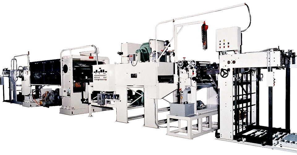 - 本機は高速全自動型として、自動紙剥がし装置、集積装置とステンレス板蛇行修正装置が標準仕様として装備されております。使用原紙の範囲は200g/から350g/です。